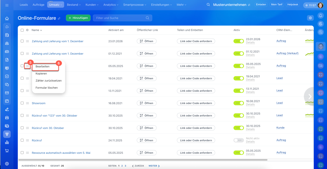 1–4. Öffnen Sie den Bereich CRM > Umsatz > Vertriebskanäle > Online-Formulare.