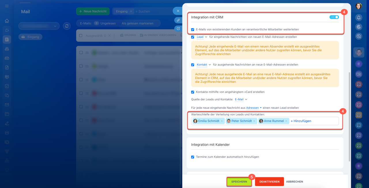 - Um die Verteilung von E-Mail-Anfragen einzurichten, öffnen Sie den Bereich E-Mail > Einstellungen (⚙️) > Integration mit CRM.