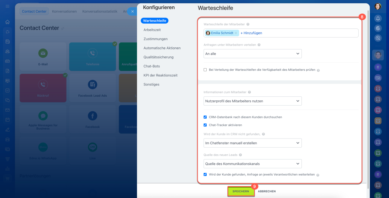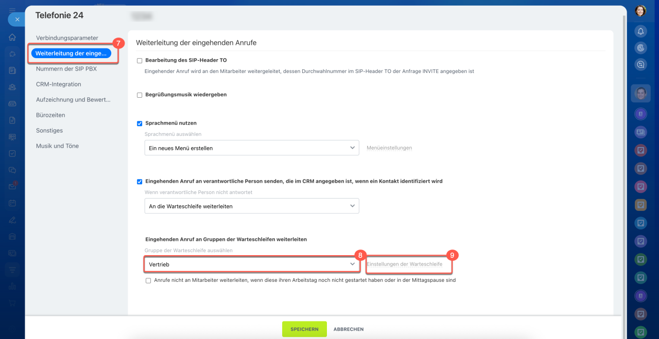 13. Nach der Konfiguration der Anrufverteilung wechseln Sie zum Tab CRM-Integration.