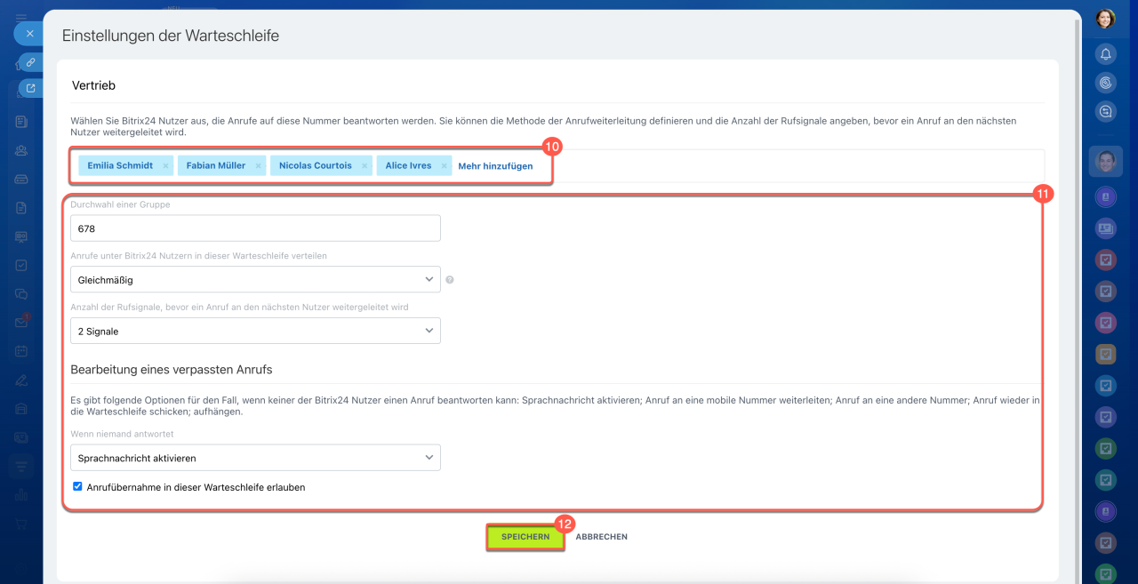 10. Geben Sie die Mitarbeiter an, die Anrufe entgegennehmen sollen. Die Reihenfolge der Mitarbeiter ist wichtig für die Verteilungsoption Entsprechend der Warteschleife.