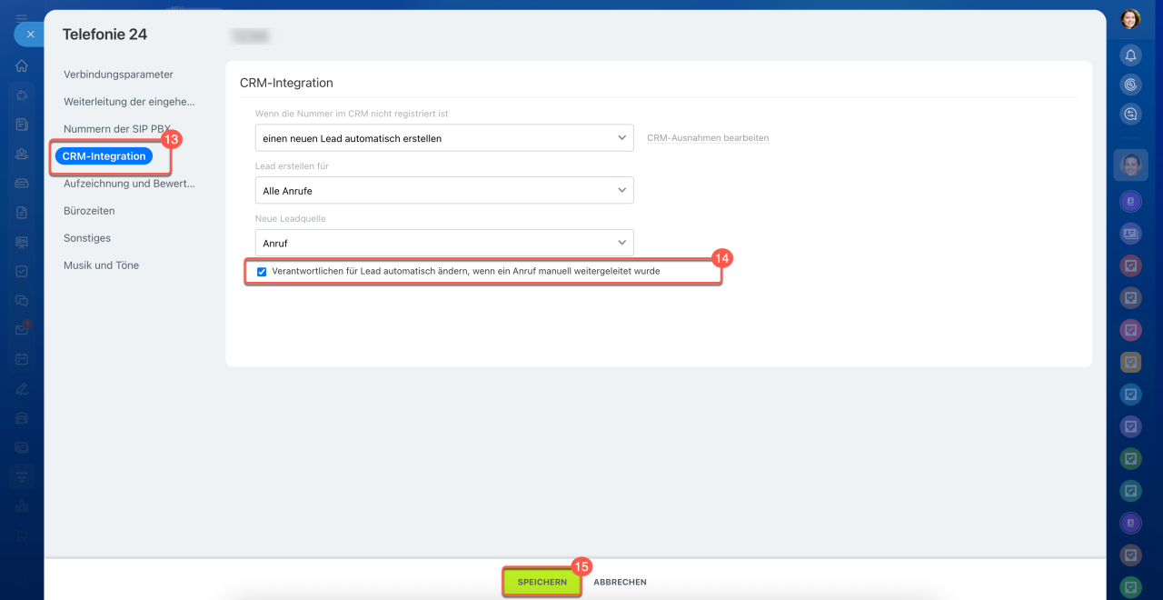 14. Aktivieren Sie die Option Verantwortlichen für Lead automatisch ändern, wenn ein Anruf manuell weitergeleitet wurde, falls der Verantwortliche bei der Weiterleitung des Anrufs geändert werden soll.