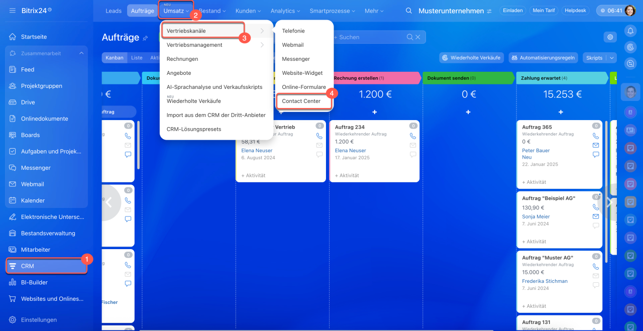 1–4. Öffnen Sie den Bereich CRM > Umsatz > Vertriebskanäle > Contact Center.