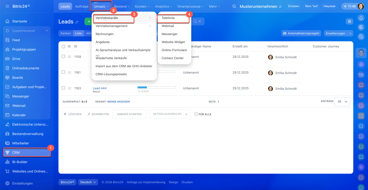 1–4. Öffnen Sie den Bereich CRM > Umsatz > Vertriebskanäle > Telefonie.
