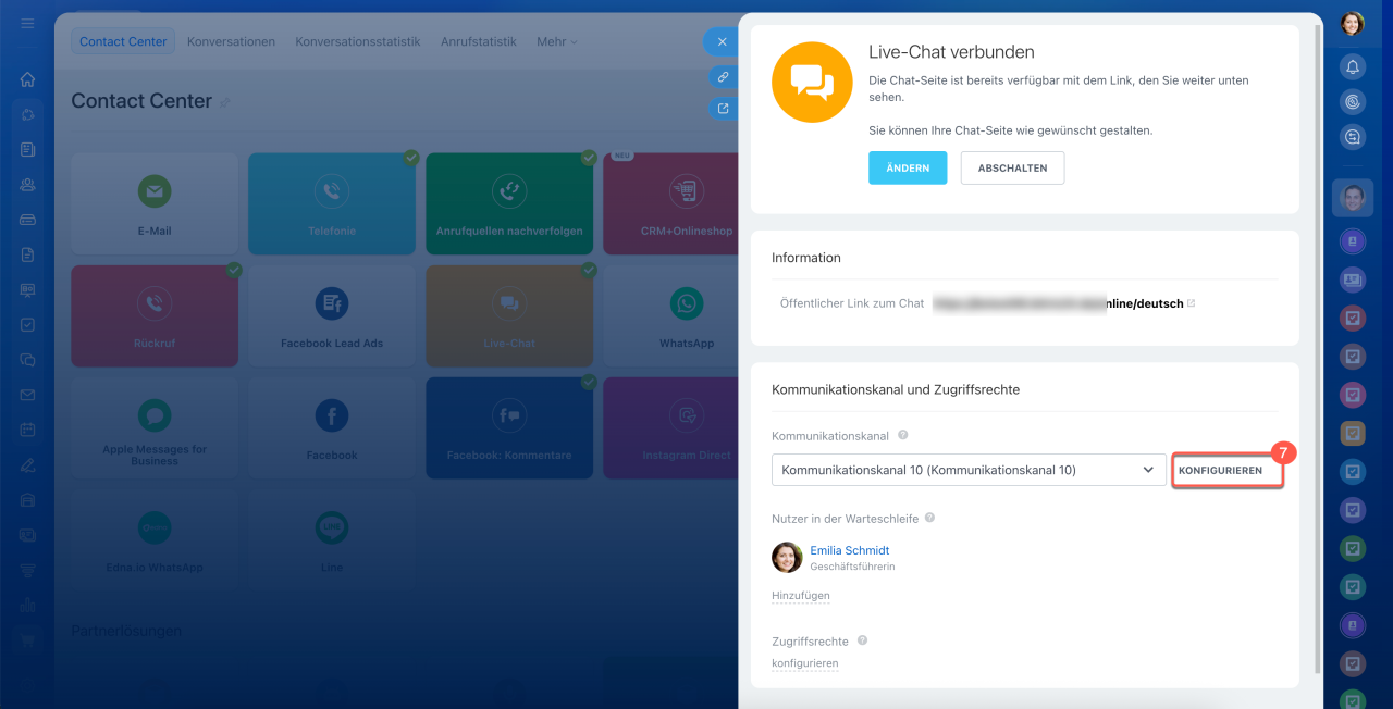 - Die Verteilung von Anfragen aus Messengern und sozialen Netzwerken wird in CRM > Umsatz > Vertriebskanäle > Contact Center konfiguriert. Wählen Sie den gewünschten Kommunikationskanal aus und klicken Sie auf Konfigurieren.