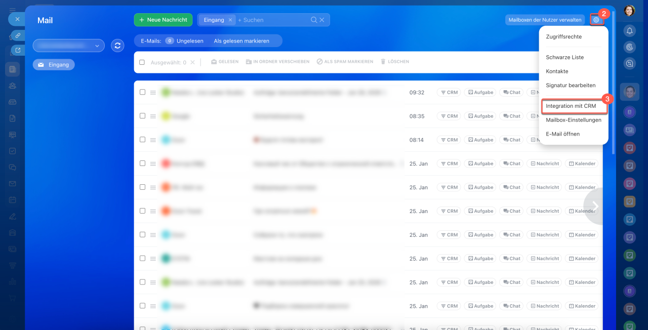 1–3. Öffnen Sie den Bereich Webmail > Einstellungen (⚙️) > Integration mit CRM.