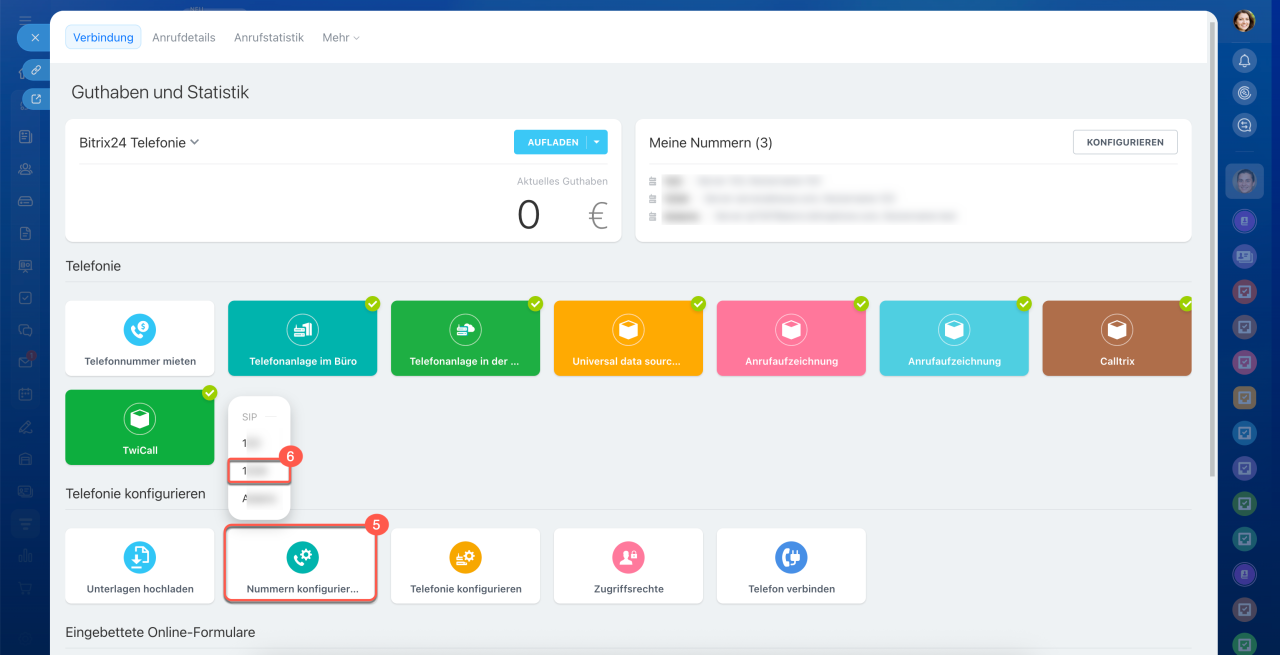 - Die Verteilung eingehender Anrufe zwischen Mitarbeitern wird in CRM > Umsatz > Vertriebskanäle > Telefonie > Nummern konfigurieren festgelegt. Wählen Sie die Nummer aus und gehen Sie zu den Tabs Weiterleitung der eingehenden Anrufe und CRM-Integration.