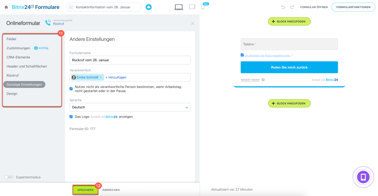 11. Bei Bedarf können Sie zusätzliche Felder hinzufügen, das Design anpassen oder weitere Parameter konfigurieren.