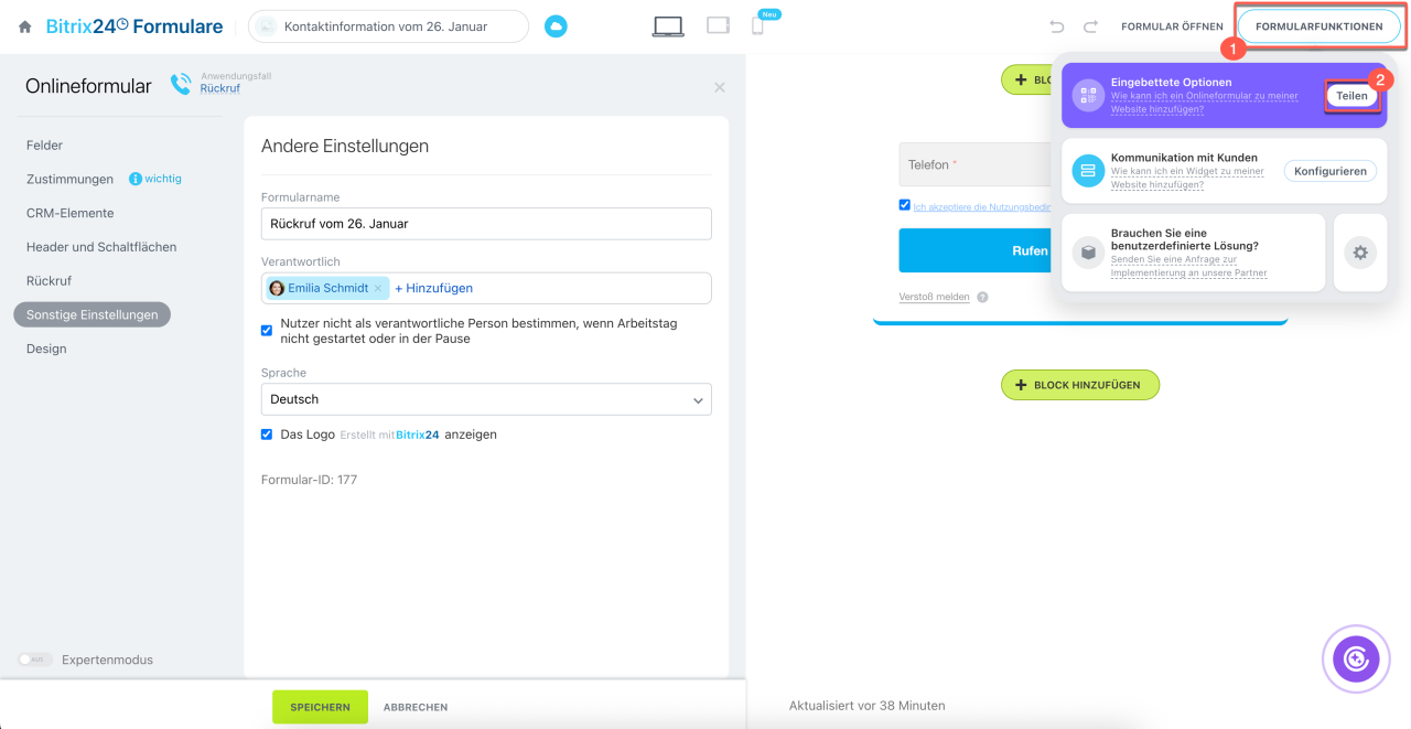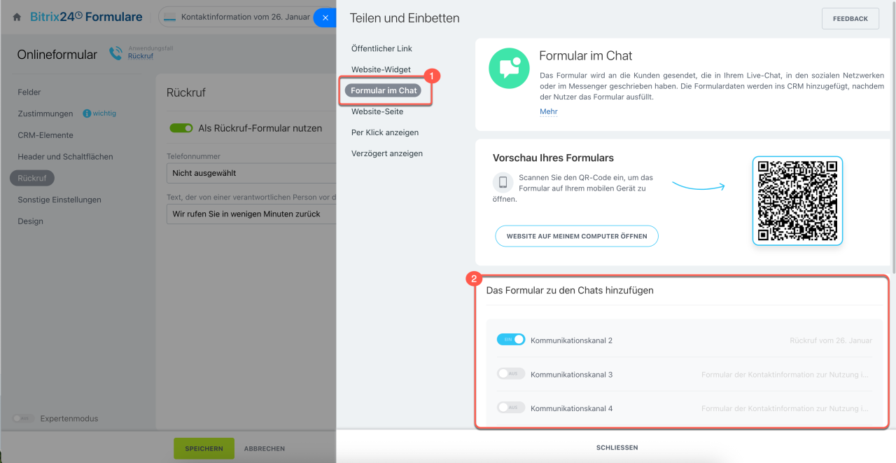 Das Rückruf-Formular kann auf einer separaten Seite, auf einer Website oder in einem Chat mit dem Kunden veröffentlicht werden. Klicken Sie auf Formularfunktionen > Teilen und wählen Sie eine Veröffentlichungsoption aus.