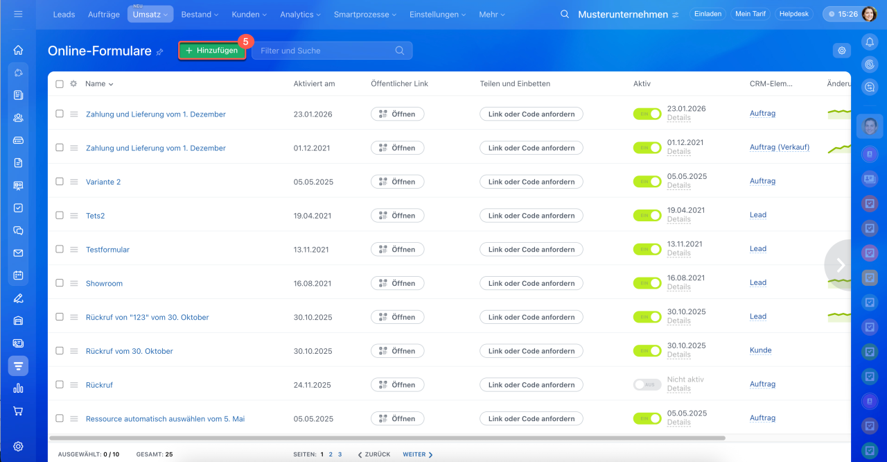 1–4. Öffnen Sie den Bereich CRM > Umsatz > Vertriebskanäle > Online-Formulare.