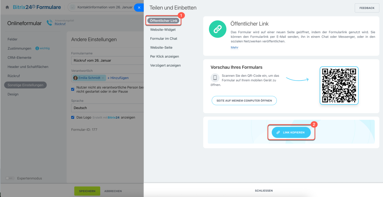 Auf einer separaten Seite. Wählen Sie Öffentlicher Link > Link kopieren. Den generierten Link können Sie per E-Mail, Messenger oder in sozialen Netzwerken teilen. Das Rückruf-Formular öffnet sich dann auf einer eigenen Seite für Ihre Kunden.
