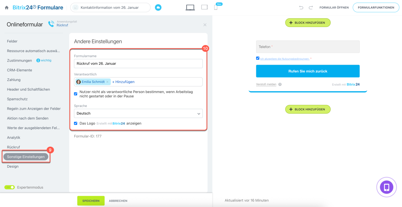 - weisen Sie Verantwortliche zu – diese erhalten die CRM-Elemente, die nach dem Ausfüllen des Formulars erstellt werden,