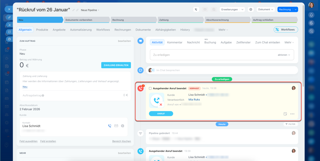 Der Mitarbeiter kann keine eingehenden Anrufe empfangen. Im CRM wird ein Element mit den Kundendaten erstellt. In der Timeline erscheint automatisch eine Aktivität über den verpassten Anruf. Der Mitarbeiter sieht das neue Element und kann den Kunden über die Schaltfläche Anrufen im Online-Formular zurückrufen.
