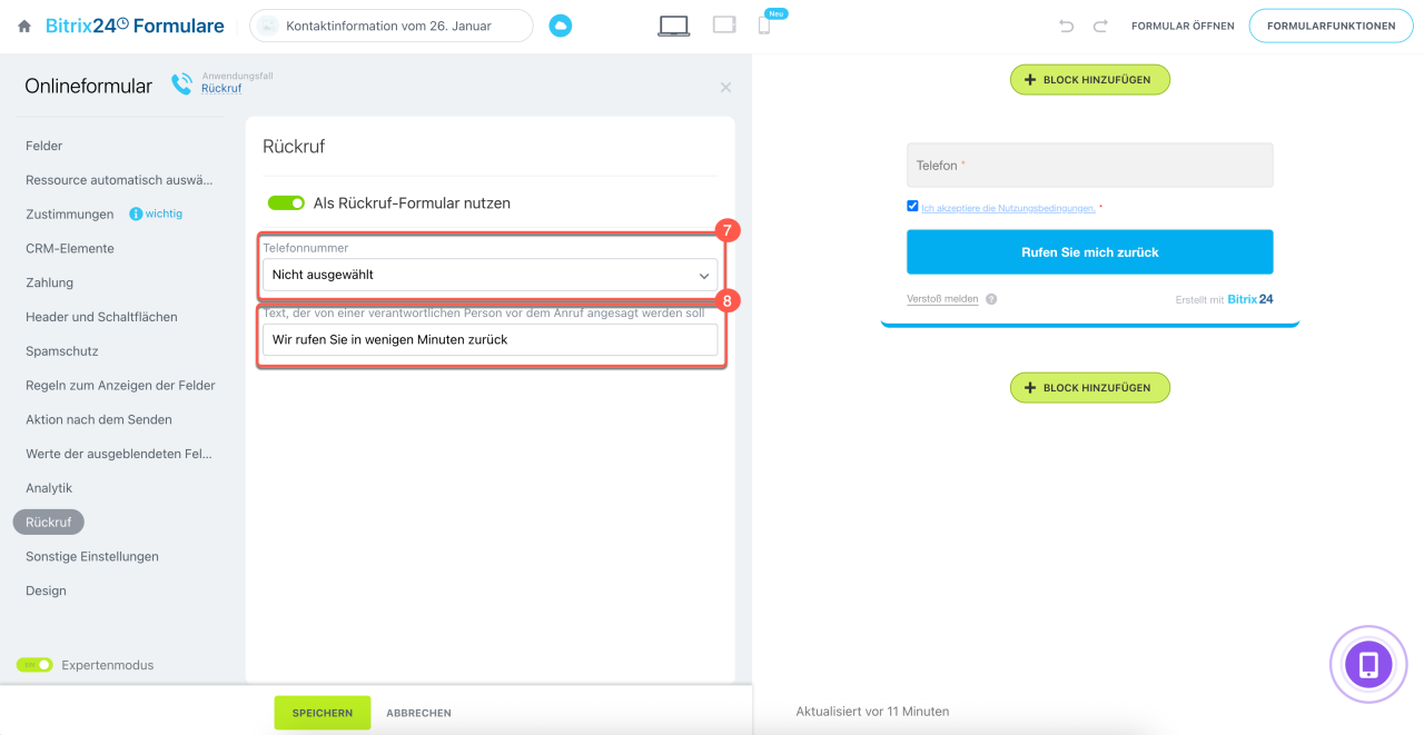 7. Wählen Sie im Feld Telefonnummer die Rufnummer aus, unter der der Kunde zurückgerufen werden soll.