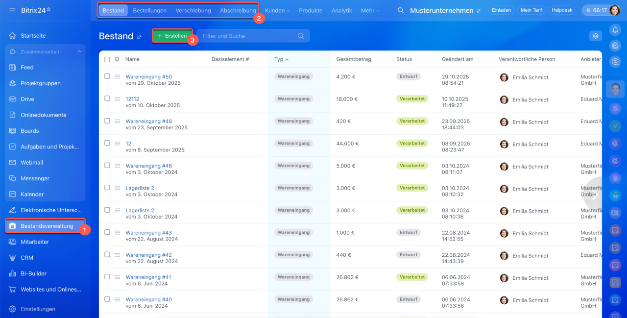 1–3. Öffnen Sie den Bereich Bestandsverwaltung, wählen Sie den gewünschten Dokumenttyp aus und klicken Sie auf Erstellen.