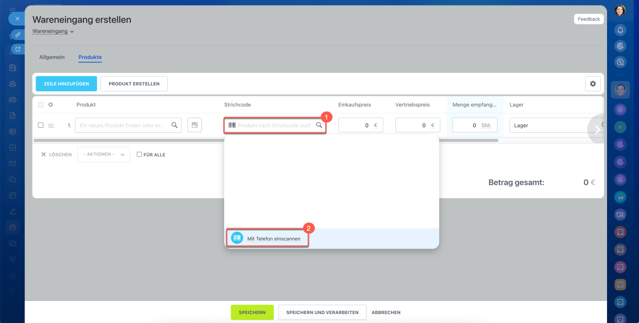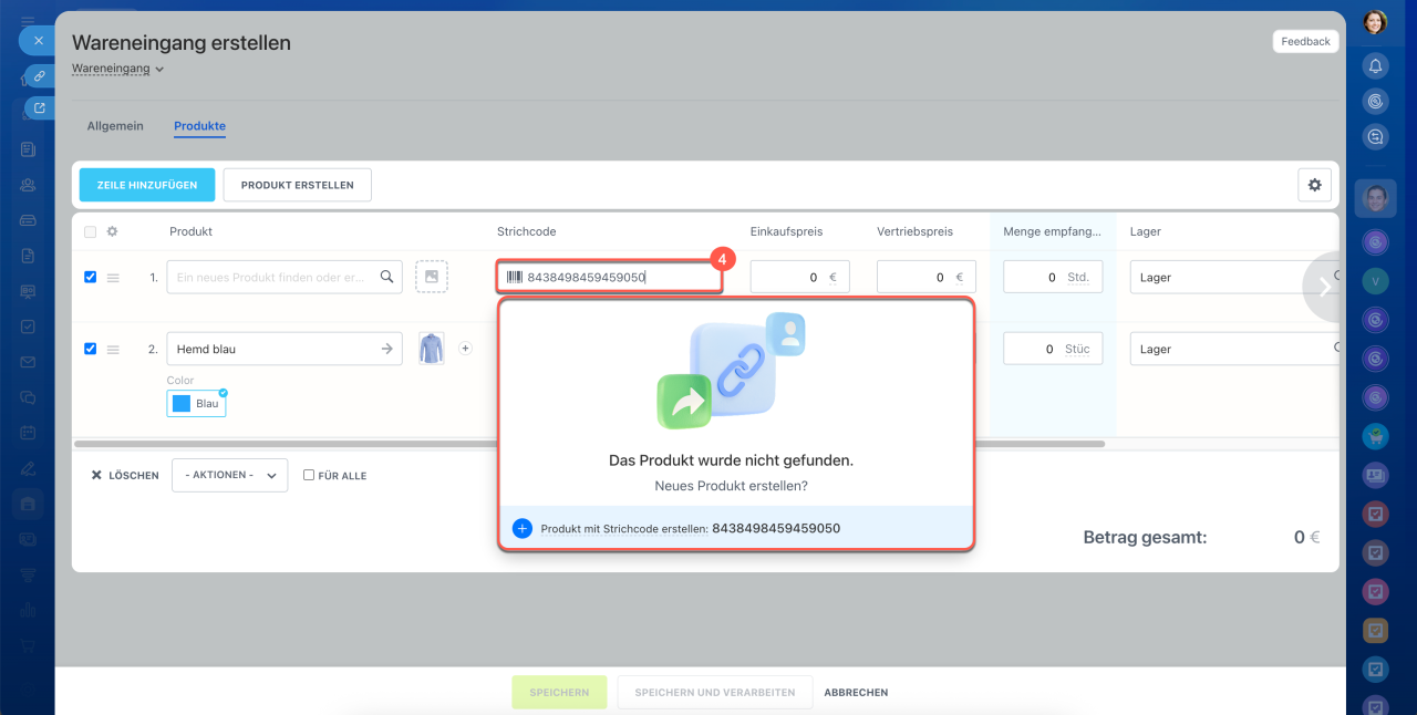 Wenn ein Produkt mit diesem Strichcode bereits im Katalog vorhanden ist, fügt Bitrix24 es automatisch in das Dokument ein. Falls das Produkt nicht gefunden wird, bietet Bitrix24 an, eine neue Position zu erstellen und den Strichcode dafür zu speichern.