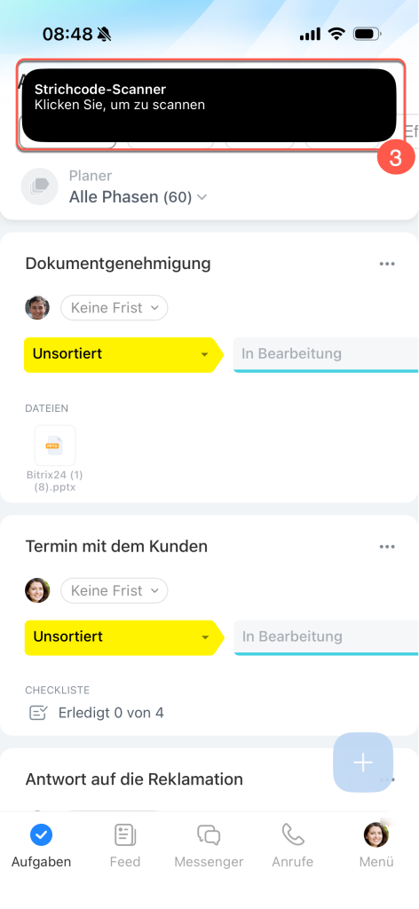 - Strichcodes können mit einem USB-Scanner am Computer oder über die mobile Anwendung von Bitrix24 verwendet werden.