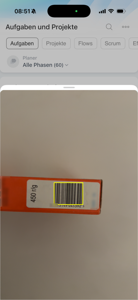 Nach dem Scannen des Strichcodes wird das Produkt direkt im Dokument angezeigt. Um weitere Produkte hinzuzufügen, schließen Sie die Kamera nicht einfach, sondern scannen Sie die nächsten Strichcodes nacheinander – das System fügt automatisch neue Zeilen im Dokument hinzu.