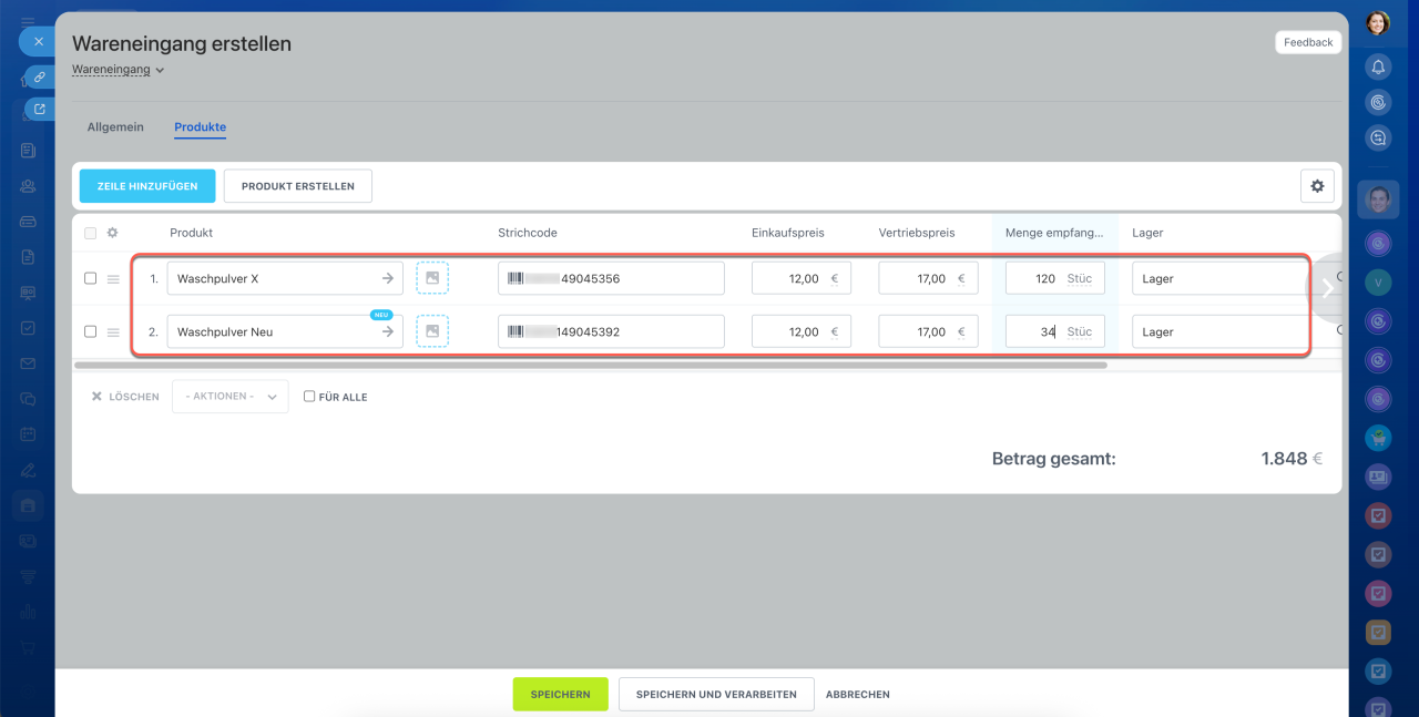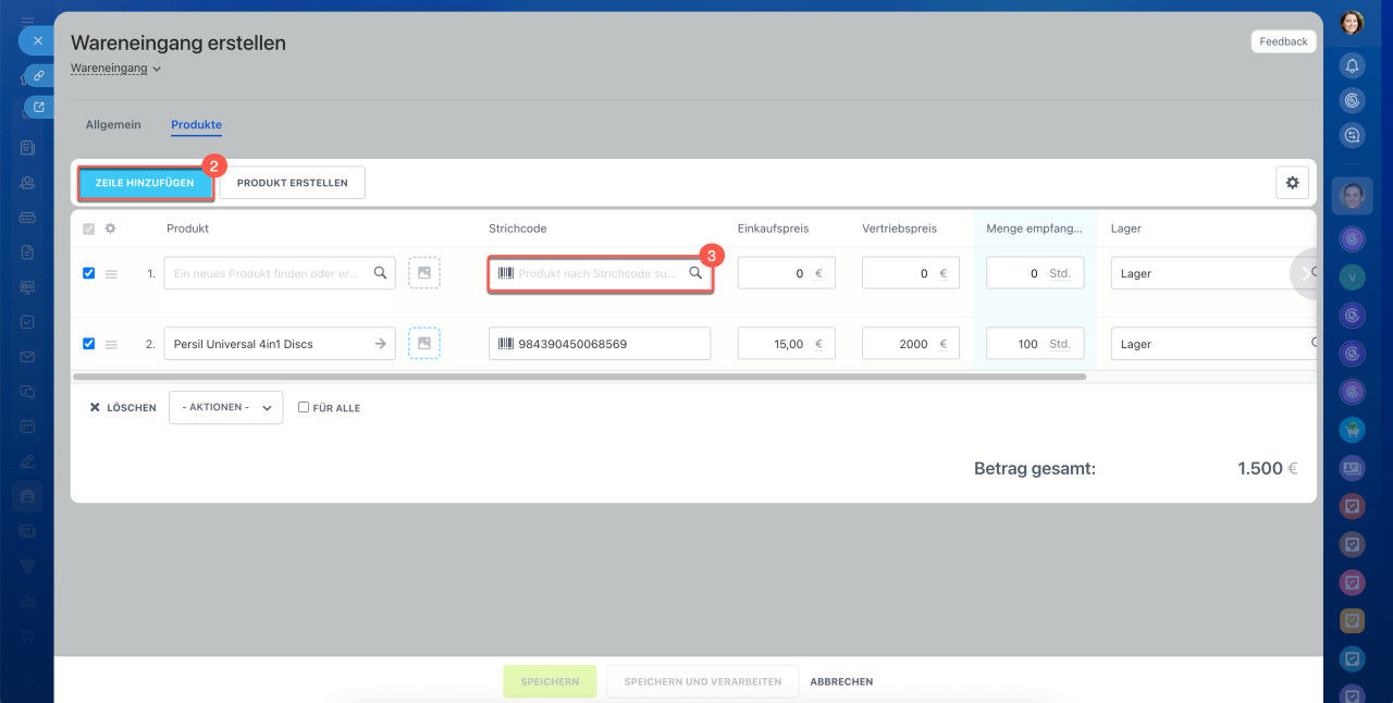 2. Um ein weiteres Produkt hinzuzufügen, klicken Sie auf Zeile hinzufügen, setzen Sie den Cursor erneut in das Feld Strichcode und scannen Sie den nächsten Code.