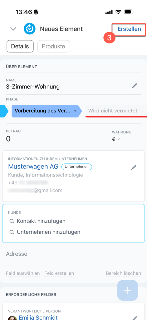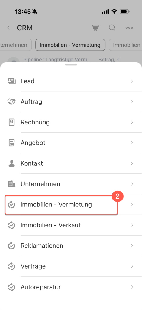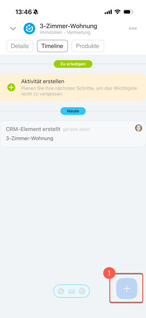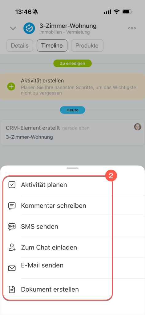 Mit dem erstellten Element können Sie wie im Browser auf dem Computer arbeiten: Aktivitäten planen, E-Mail-Nachrichten und SMS an Ihre Kunden senden, abhängig davon, wie die Arbeitsabläufe in Ihrem Unternehmen organisiert sind. Klicken Sie im Bereich Timeline auf + (1) in der rechten Ecken unten und wählen Sie die gewünschte Option (2) aus.