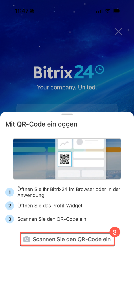 Die Anmeldung per QR-Code ist möglich, wenn Sie bereits im Browser oder im Bitrix24-Messenger angemeldet sind. Diese Methode ist praktisch, um sich schnell ohne Eingabe von Login und Passwort anzumelden.