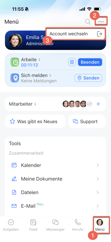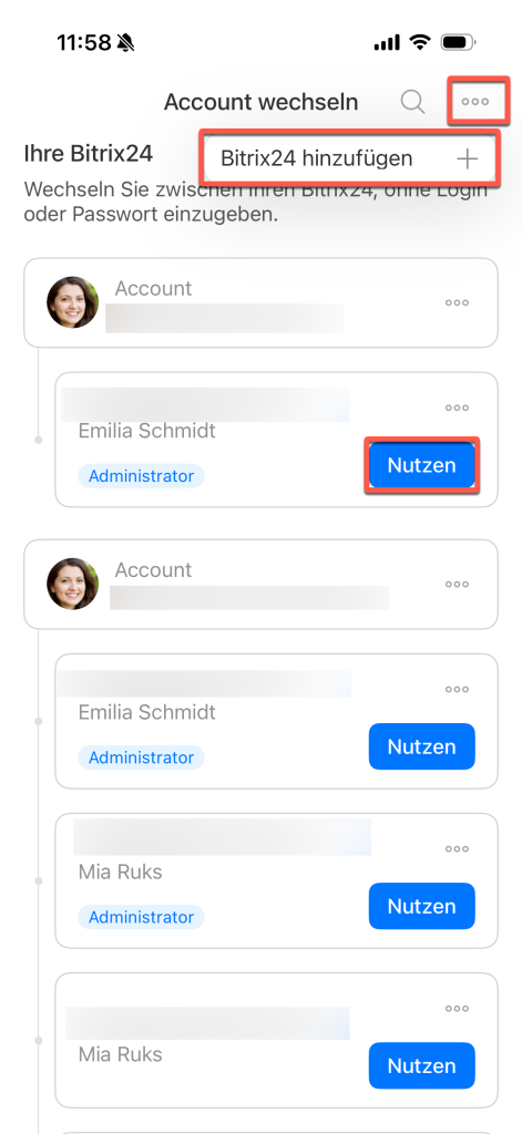 - In der mobilen App können Sie mehrere Bitrix24-Accounts hinzufügen und zwischen ihnen wechseln. Tippen Sie auf Menü > Drei Punkte > Account wechseln.