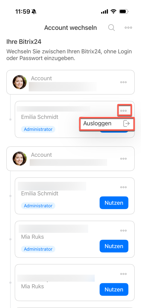 In der Bitrix24-Mobile-App können Sie mehrere Accounts verwalten und flexibel zwischen ihnen wechseln. Das ist besonders nützlich, wenn Sie mit verschiedenen Unternehmen oder Projekten arbeiten