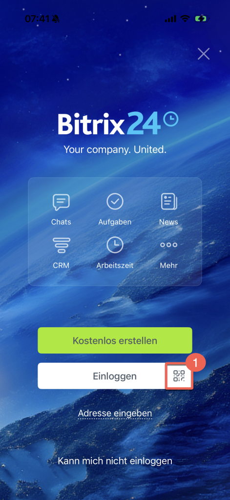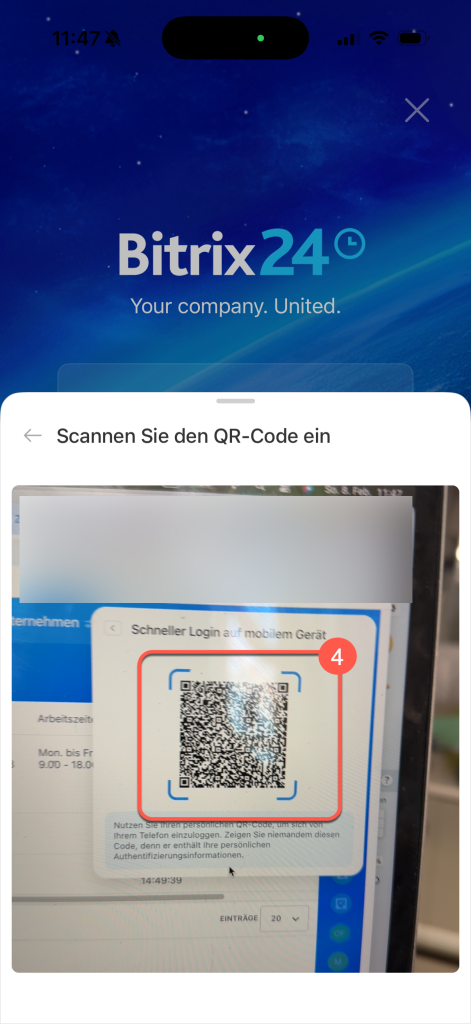 4. Richten Sie die Kamera Ihres Smartphones auf den QR-Code, der in der Bitrix24-App auf Ihrem Computer angezeigt wird. Sie sind nun erfolgreich in Bitrix24 angemeldet.