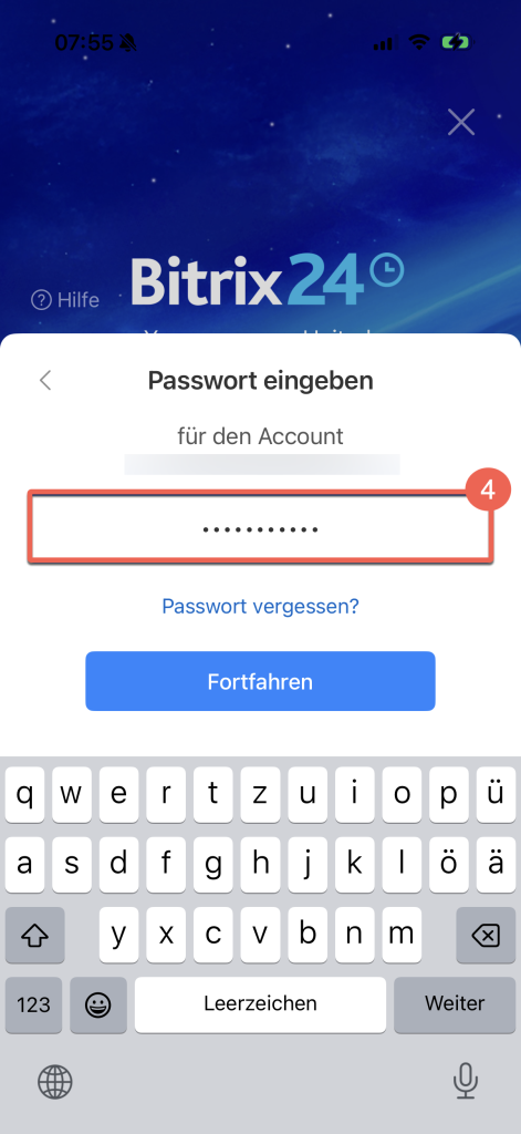 4. Geben Sie Ihr Passwort ein und tippen Sie auf Weiter. Sie sind nun erfolgreich in Bitrix24 angemeldet.