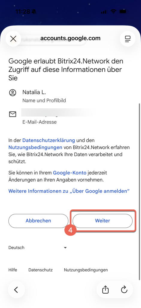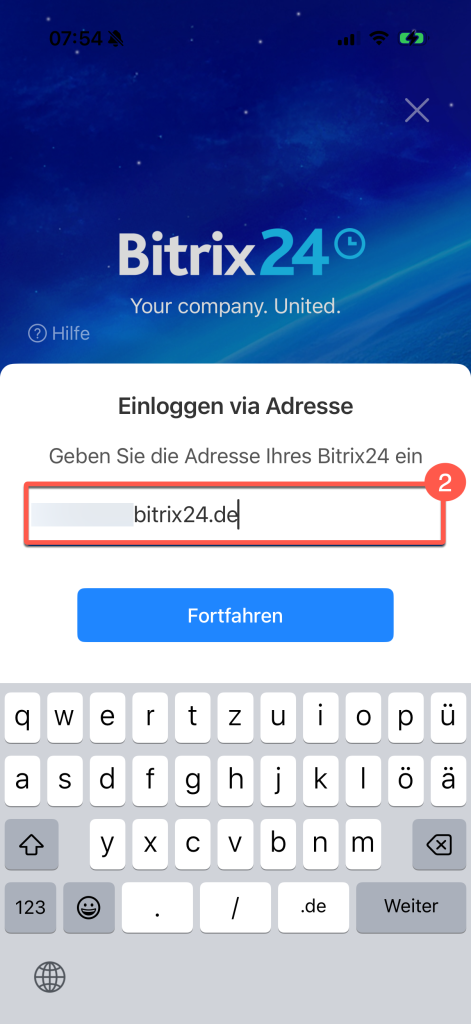 2. Geben Sie die Adresse Ihres Bitrix24 ein, z. B. mycompany.bitrix24.de, und tippen Sie auf Weiter.