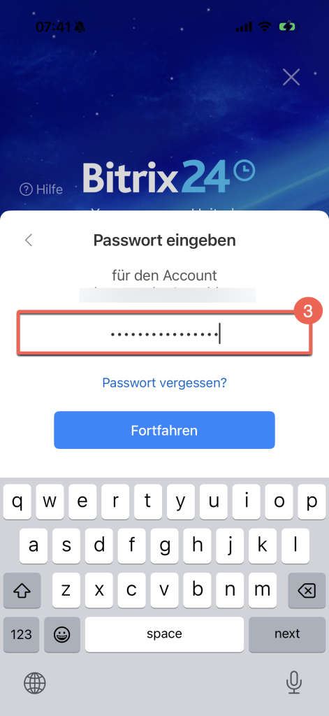 3. Geben Sie Ihr Passwort ein und tippen Sie auf Weiter. Sie sind nun erfolgreich in Bitrix24 angemeldet.