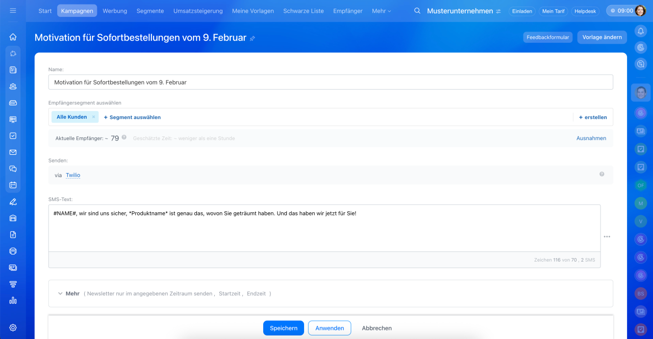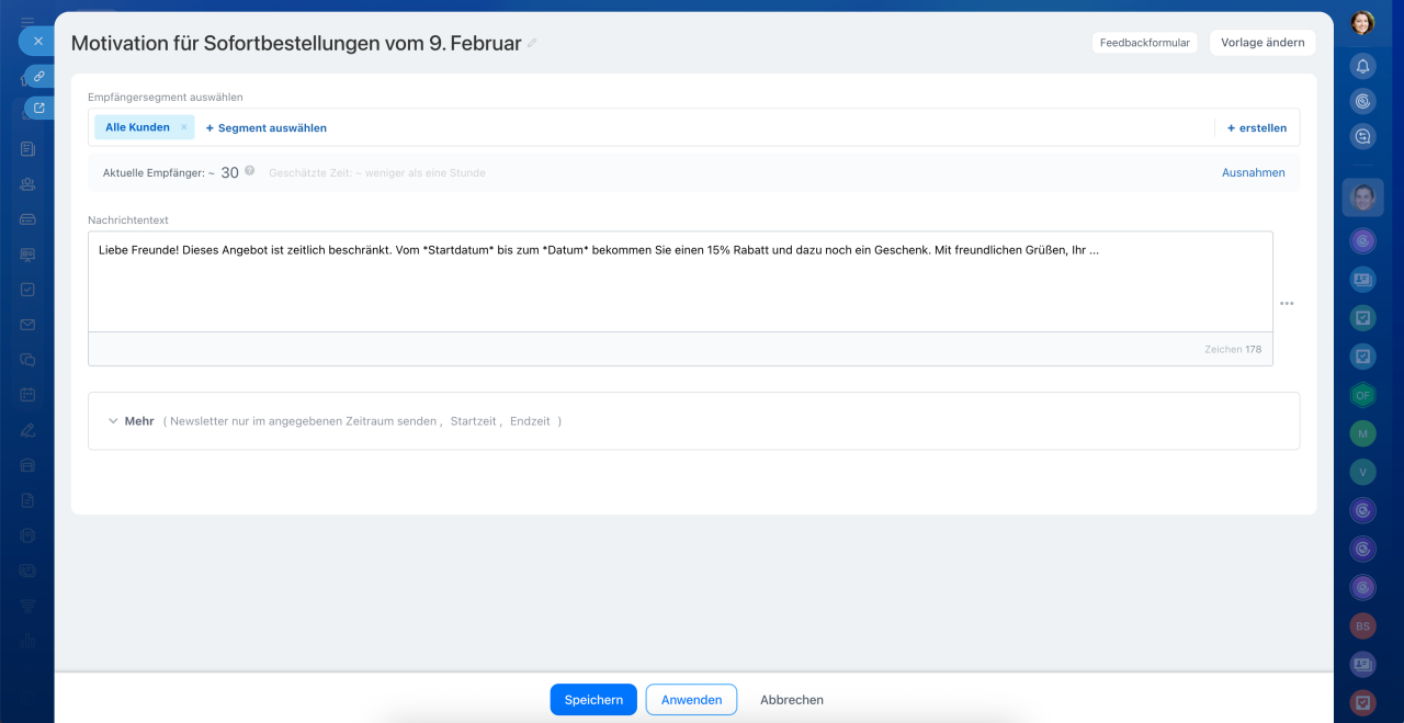 Mit Bitrix24 können Sie Massen-SMS-Kampagnen einfach und effizient durchführen. Erstellen Sie einen kurzen, prägnanten Text für Ihr ausgewähltes Segment und das System übernimmt den Versand.