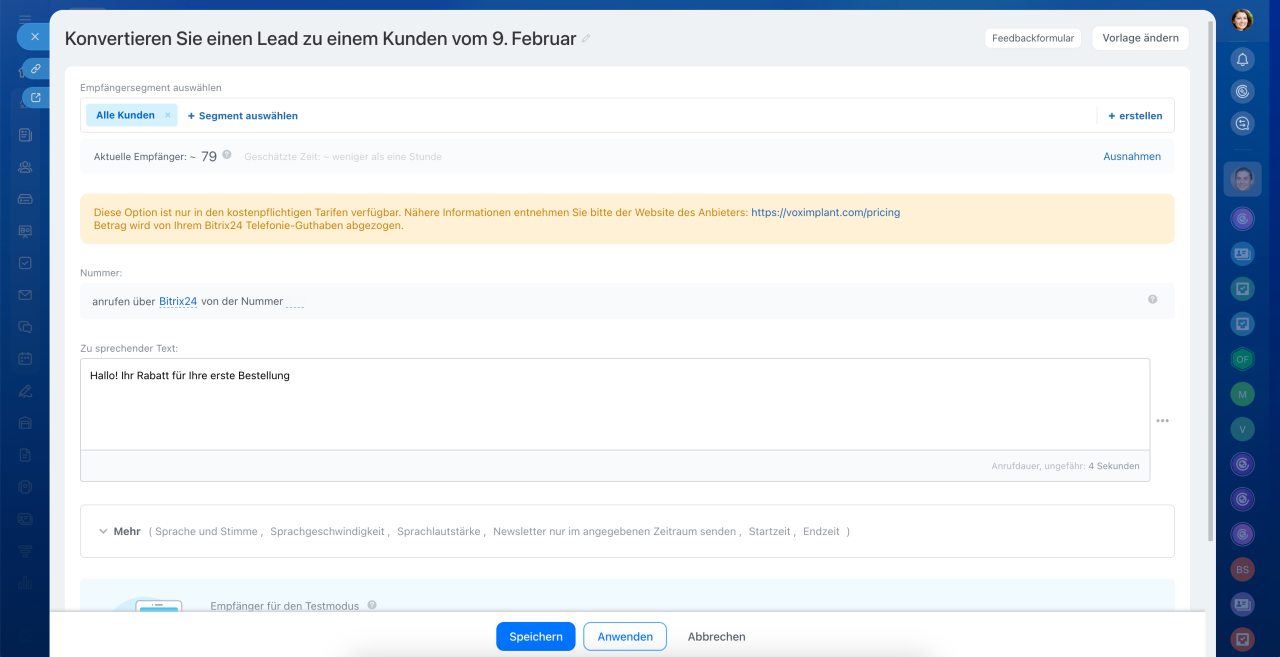 Mit automatischen Sprachübertragungen können Sie Textnachrichten in Sprachnachrichten umwandeln und an Ihre Kunden senden. Das System ruft automatisch die angegebenen Rufnummern an und übermittelt Ihre Nachricht.