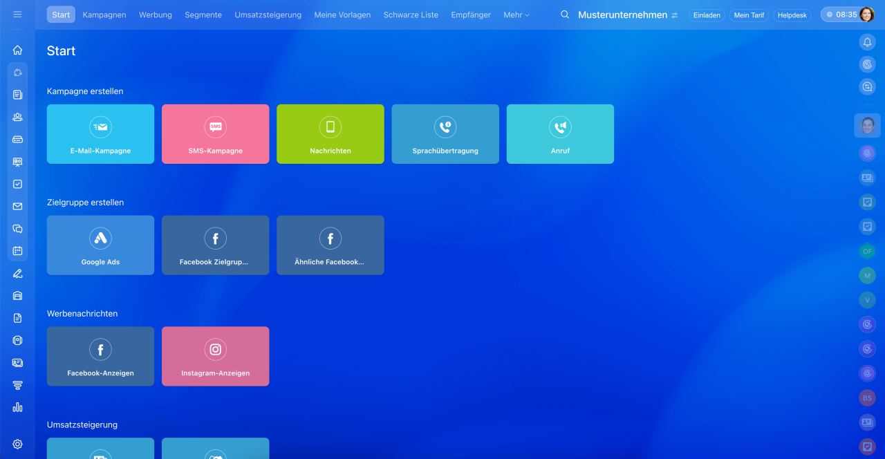 Nach der Auswahl Ihrer Zielgruppe und der Erstellung eines Segments können Sie den passenden Kanal für die Kommunikation auswählen. Bitrix24 bietet Ihnen folgende Marketing-Tools zur Auswahl: