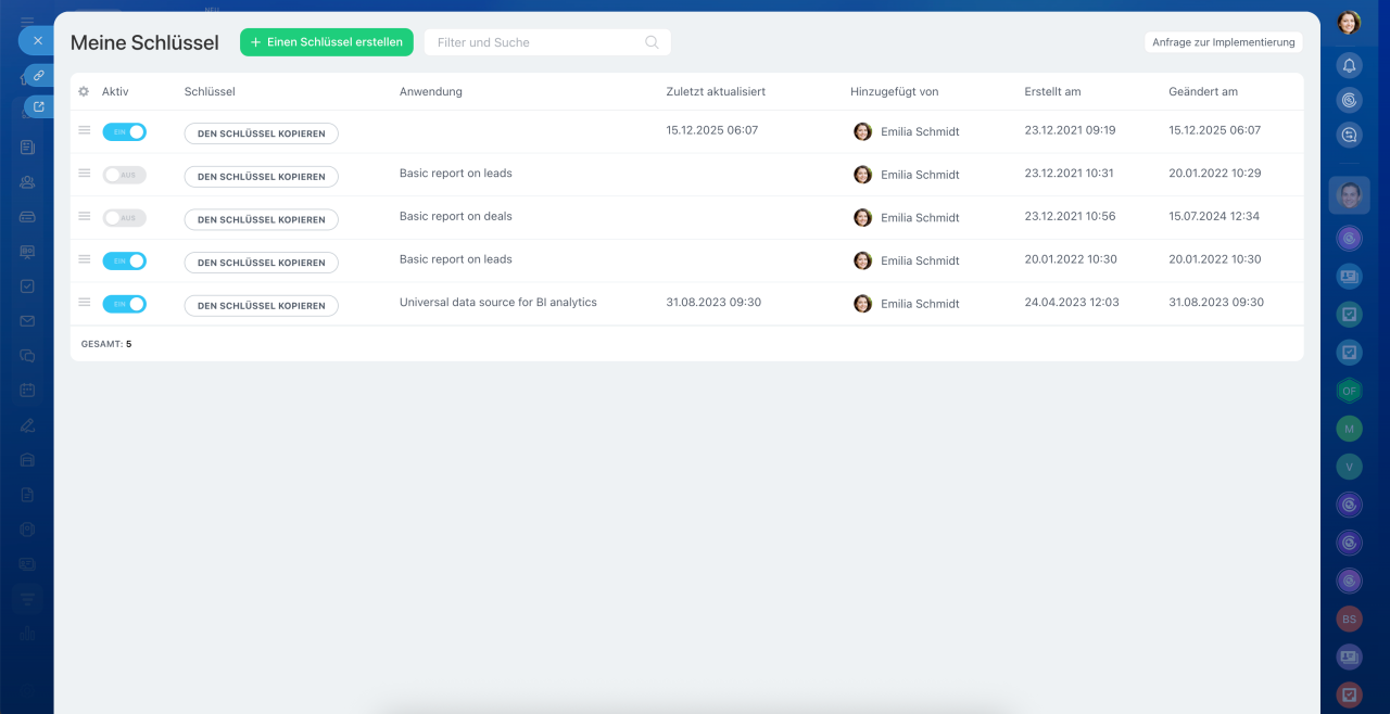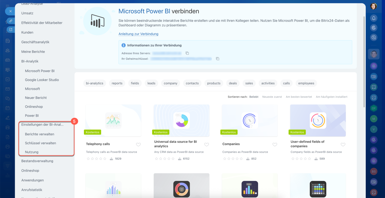 Diese Schlüssel ermöglichen es Ihnen, Daten aus Bitrix24 in externe analytische Systeme zu übertragen und Anfragen an den BI-Connector zu senden.