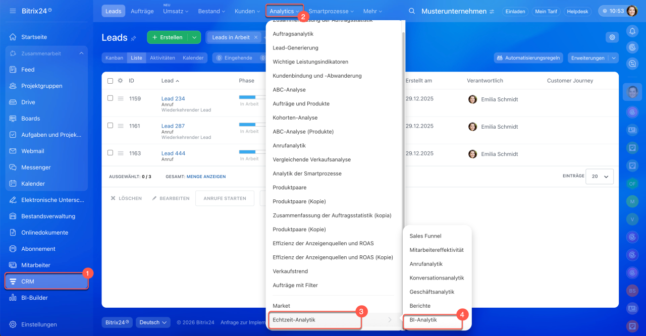 Öffnen Sie den Bereich CRM > Analytics > Echtzeit-Analytik > BI-Analytik > Einstellungen der BI-Analytik.