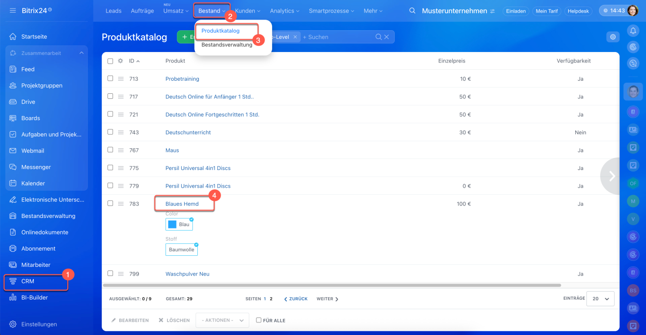 1–4. Gehen Sie auf CRM > Bestand > Produktkatalog und öffnen Sie das gewünschte Produkt.