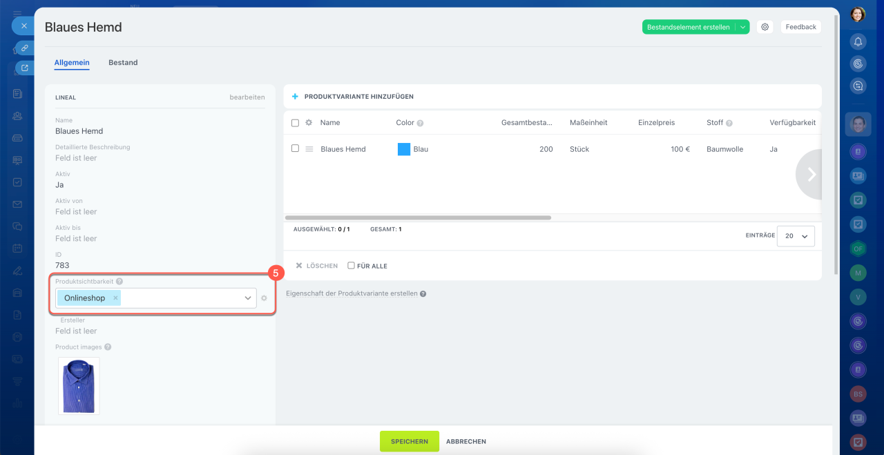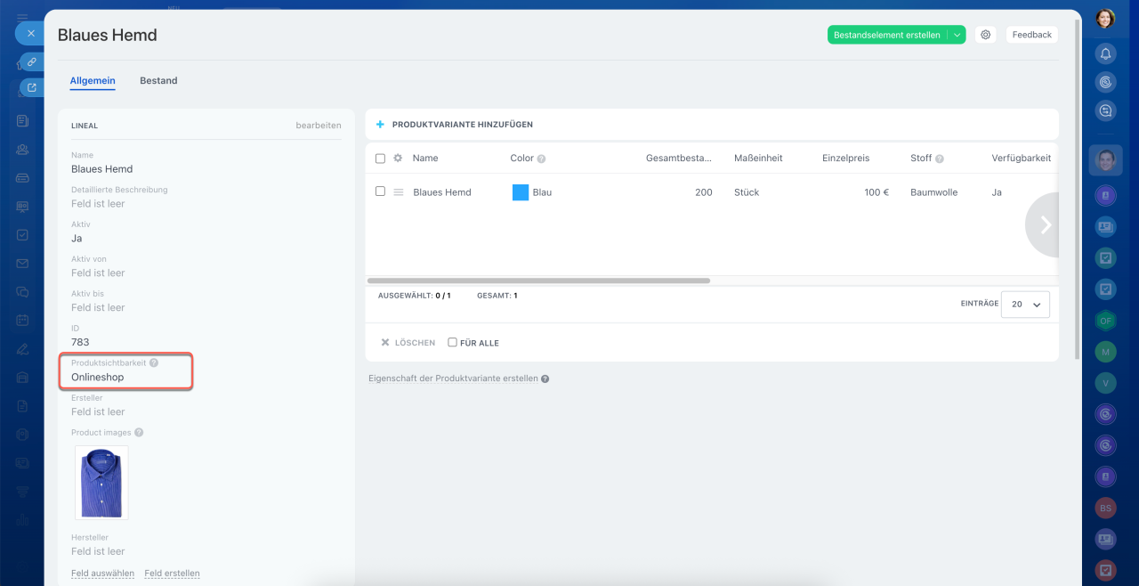 Im Produktformular finden Sie den Parameter „Produktsichtbarkeit“. So können Sie Produkte aus dem Onlineshop ausblenden, die für Kunden nicht sichtbar sein sollen.