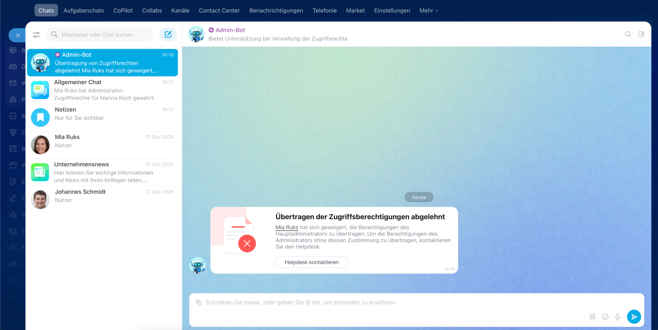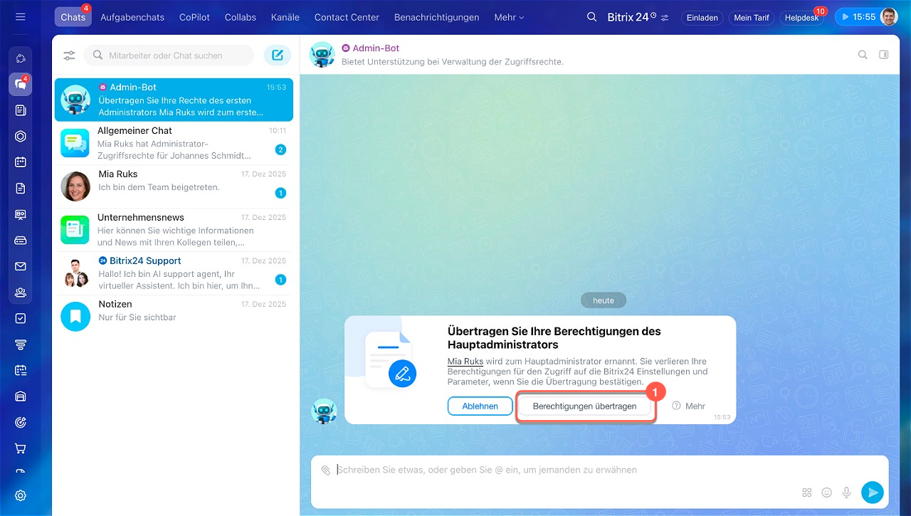 Der erste Administrator erhält eine Nachricht vom Admin-Bot mit der Bitte, die Rechte zu übertragen, sowie Informationen über den Mitarbeiter, der die Anfrage gesendet hat.