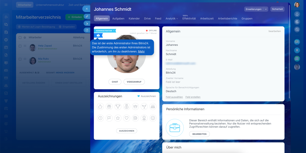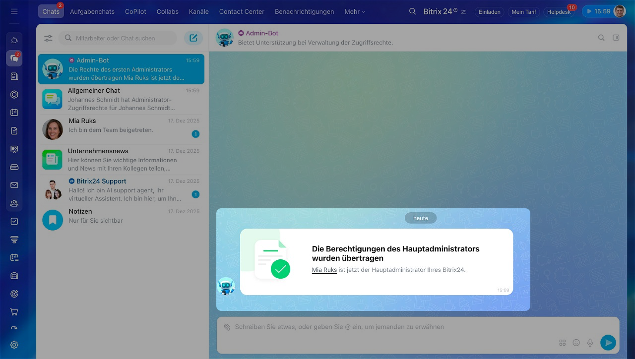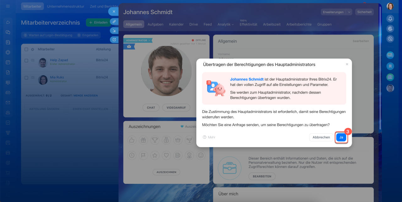 Der erste Administrator verfügt über dieselben Rechte wie andere Administratoren, jedoch mit einer wichtigen Ausnahme: Nur er kann die Übertragung der Rechte oder seine eigene Entfernung als Hauptadministrator bestätigen. Dies stellt sicher, dass niemand unbeabsichtigt oder ohne Autorisierung den Besitzer des Bitrix24-Accounts ändern kann.