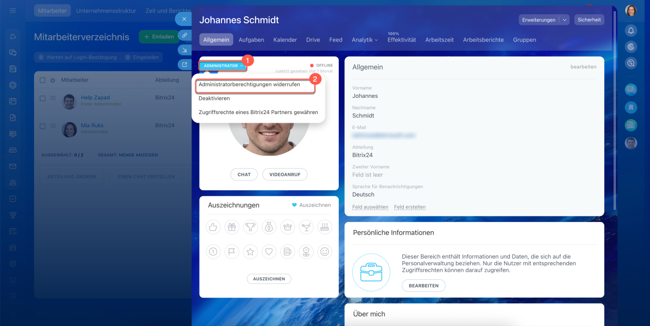 Wenn dieser Mitarbeiter Ihr Unternehmen verlässt oder nicht mehr für die Verwaltung von Bitrix24 zuständig ist, müssen seine Administratorrechte einem anderen Nutzer übergeben werden. Dies kann nur ein Mitarbeiter mit bestehenden Administratorrechten durchführen.