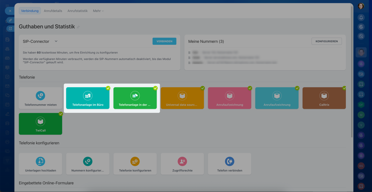 Damit Sie Anrufe im mobilen CRM empfangen können, muss Ihre Telefonie über den SIP-Connector mit Bitrix24 verbunden sein.