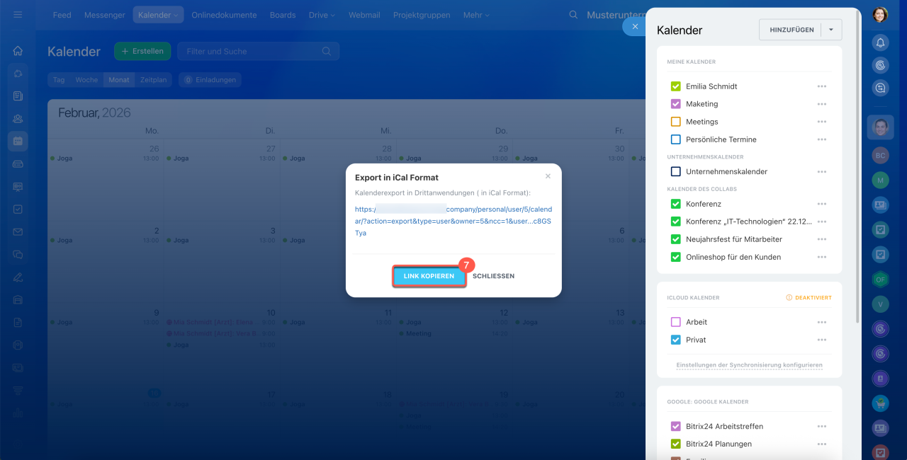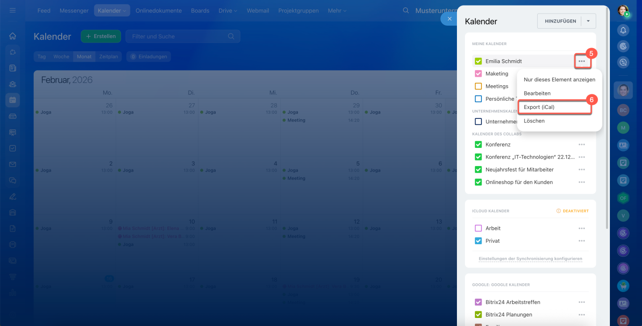 - Exportierte Termine sind statisch: Neue Termine, die Sie nach dem Export in Bitrix24 anlegen, werden nicht automatisch im externen Kalender angezeigt.