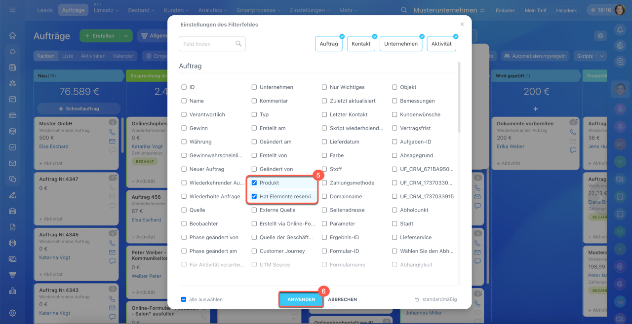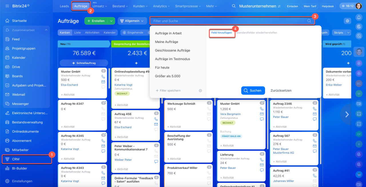 1–4. Gehen Sie auf CRM > Aufträge, öffnen Sie den Filter und klicken Sie auf Feld hinzufügen.
