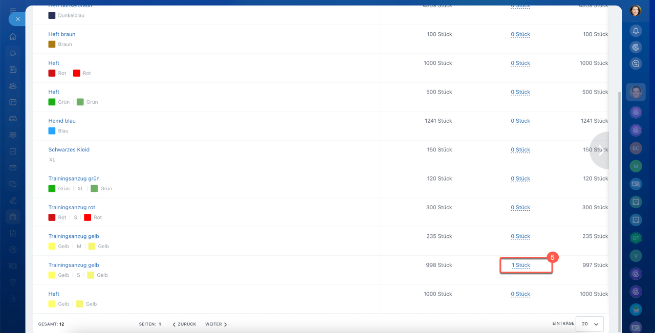 4–5. Wechseln Sie zum Tab Produkte und klicken Sie auf den Wert in der Spalte Verfügbarer Bestand.