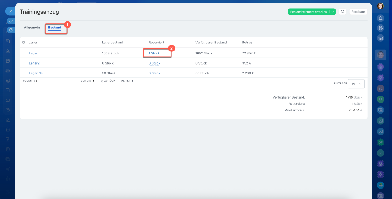 - Verfügbarer Bestand – Differenz zwischen Menge und Reservierung. Dies ist die tatsächliche Produktmenge, die noch verkauft oder reserviert werden kann.