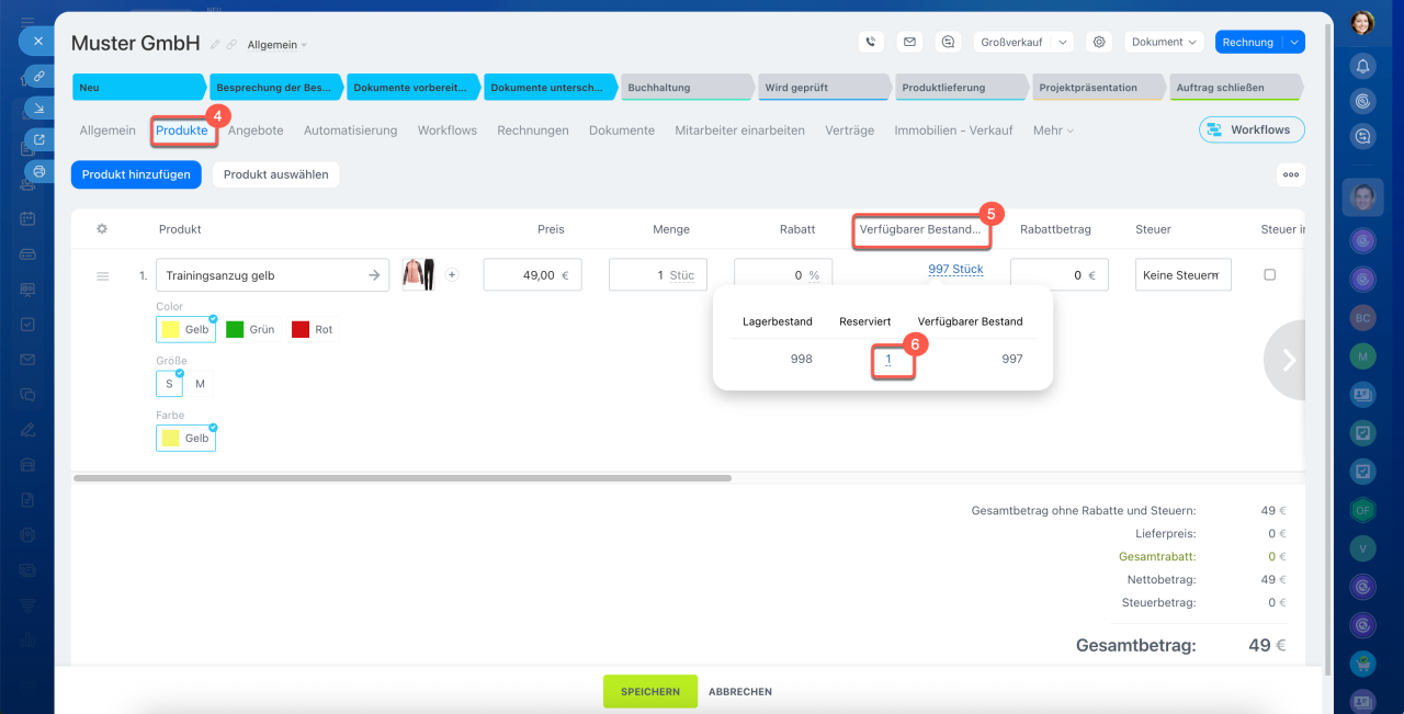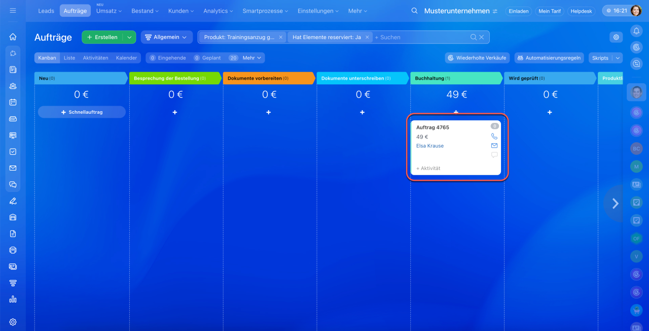 - Es ist möglich, die Aufträge mit reservierten Produkten im Auftragsformular, über einen Filter im CRM, im Produktformular und im Bericht über aktuelle Lagerbestände zu überprüfen.