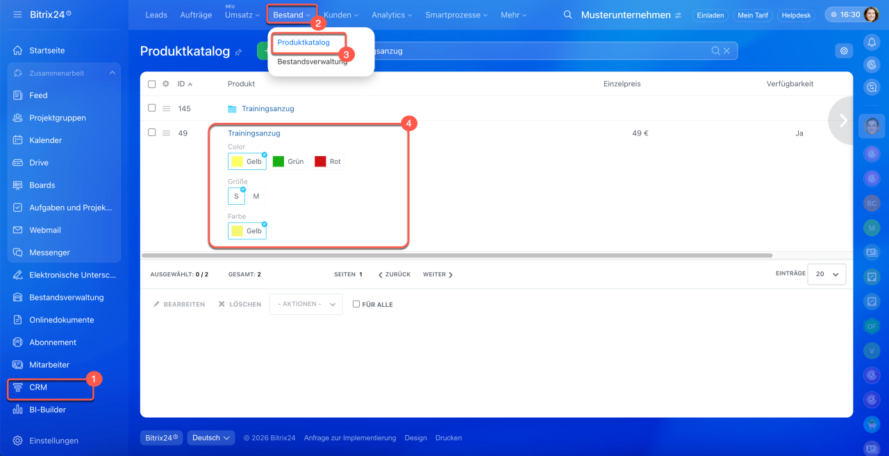 1–4. Gehen Sie auf CRM > Bestand > Produktkatalog und öffnen Sie das gewünschte Produktformular.