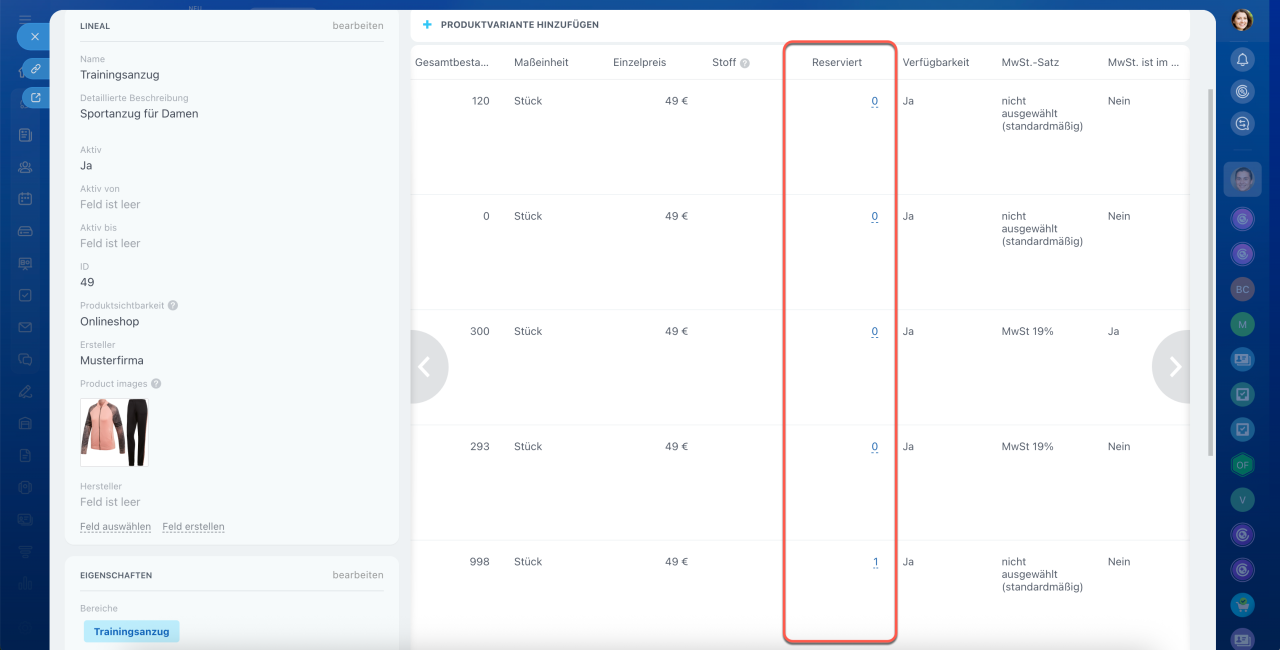 - Reservierung – Menge des Produkts, die bereits in anderen Aufträgen reserviert ist.
