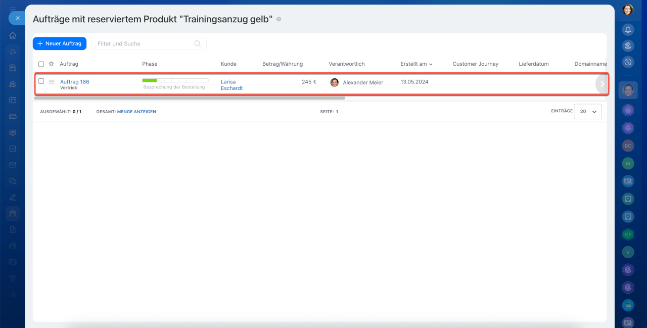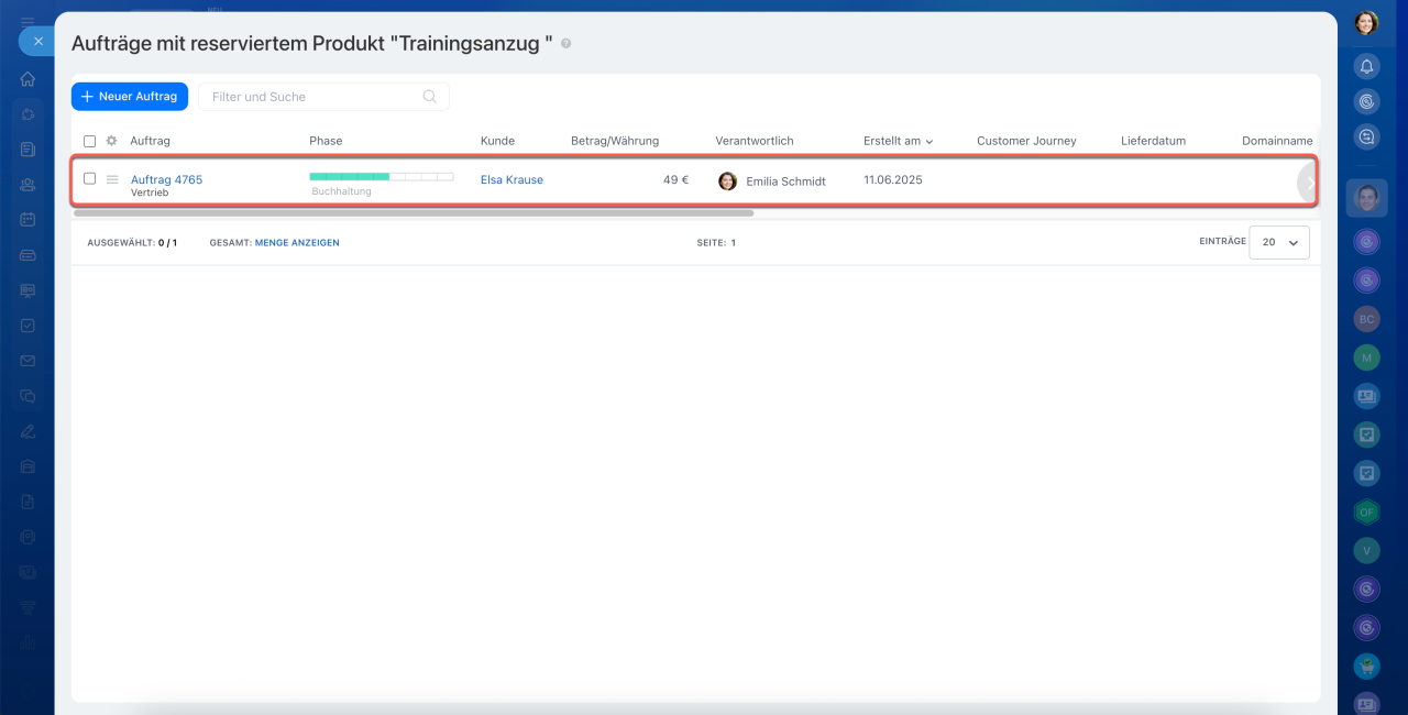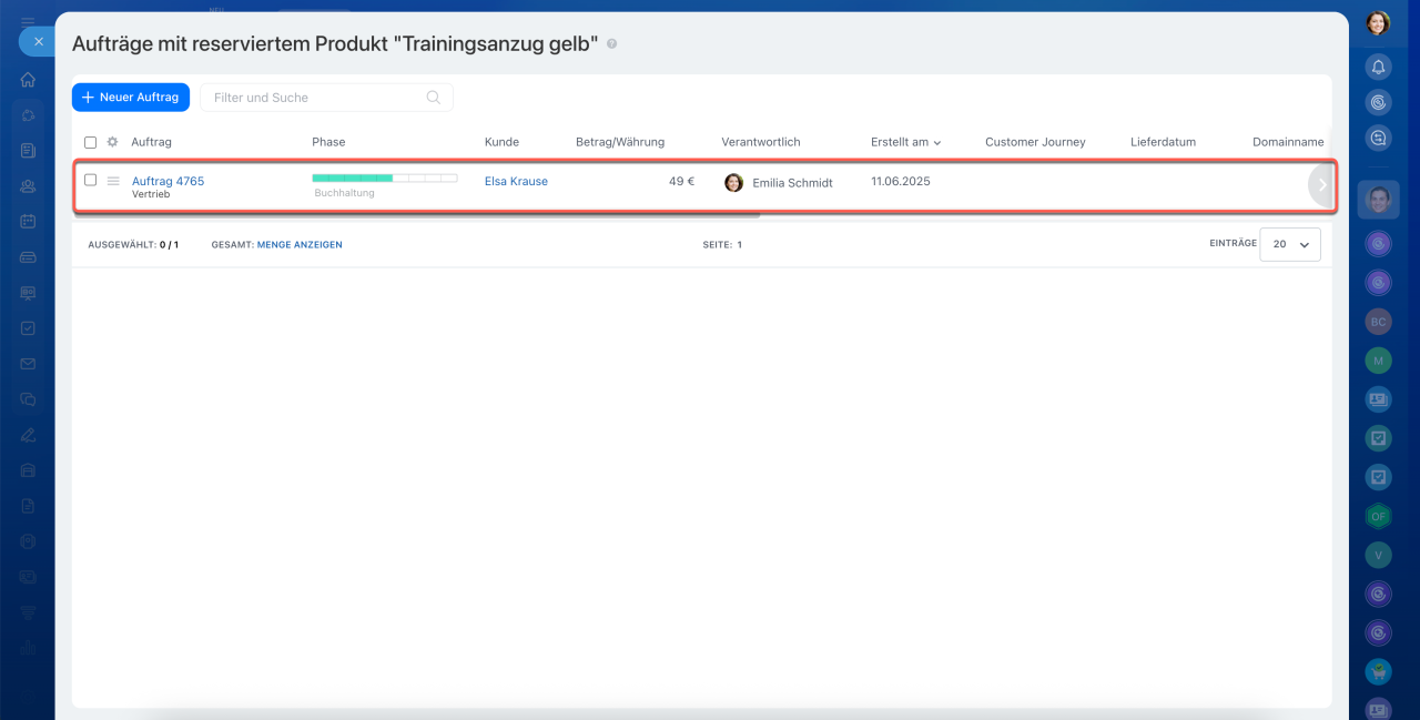 Das CRM zeigt Aufträge an, in denen das ausgewählte Produkt reserviert ist.