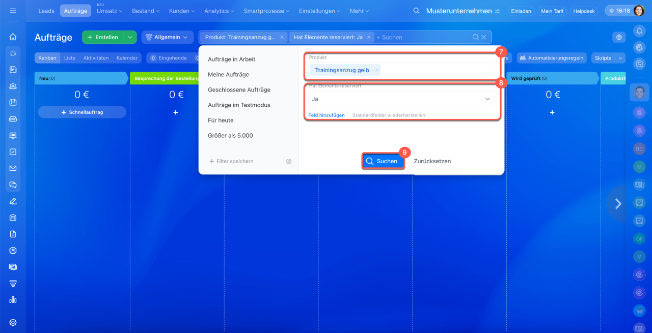 Mit dem Filter können Sie alle Aufträge finden, die ein bestimmtes Produkt enthalten, und prüfen, ob dieses Produkt reserviert ist.